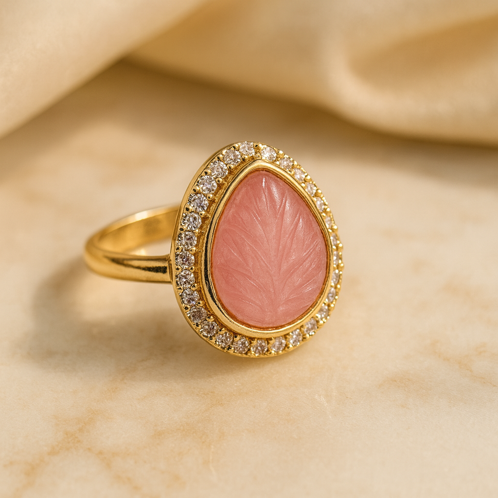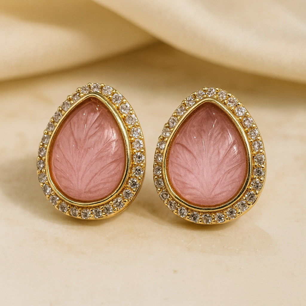 Enhance your elegance with this exquisite jewellery set featuring a hand-carved pink stone crafted in a delicate leaf pattern. Designed in a timeless teardrop silhouette and surrounded by a sparkling halo of premium CZ stones, this set adds a luxurious yet graceful touch to any outfit.