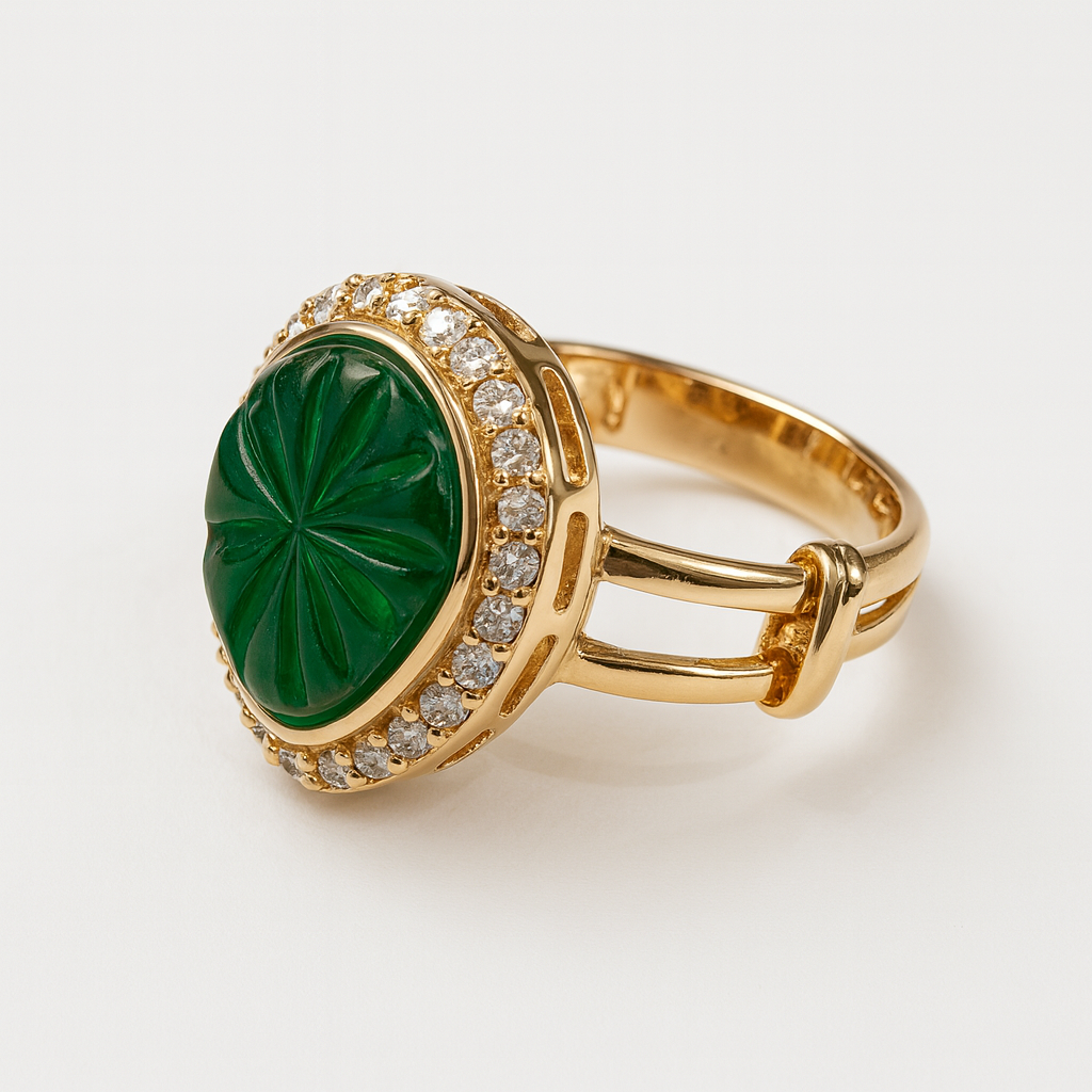 Β Teardrop-shaped carved green stone with an intricate leaf/floral motif