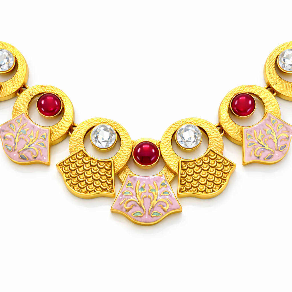 Radiate feminine grace with the Jinam Exclusive Blush Enamel Pearl Imitation Necklace Set, a striking blend of artistry and elegance. This exquisite piece features alternating circular and lotus-inspired motifs finished in soft blush-pink enamel, enhanced by glimmering red and white imitation stones.