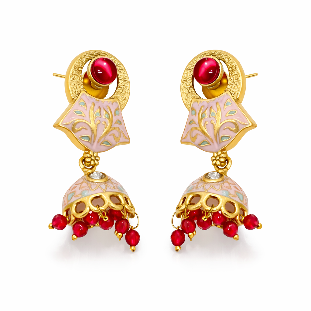 Each motif showcases fine golden engraving that adds texture and dimension, while the intricate design flows gracefully along the neckline. The earrings perfectly mirror the necklace’s delicate detailing — adorned with red stones, pastel enamel, and miniature jhumka drops with ruby bead tassels that exude festive charm.