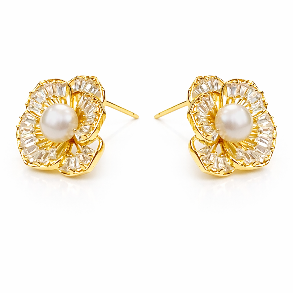 Surrounded by shimmering American Diamond stones arranged like delicate petals, these earrings reflect timeless charm and refined elegance.