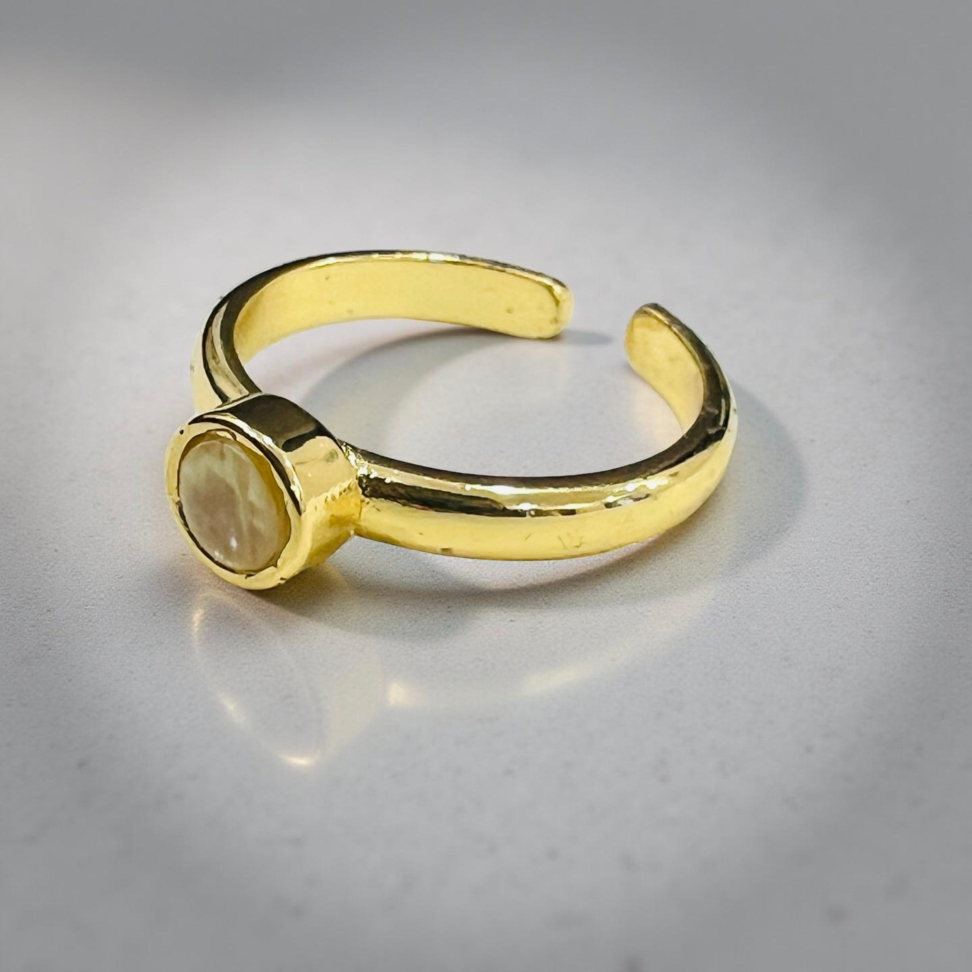 Elevate your everyday style with this elegant gold-tone adjustable ring, featuring a beautiful round iridescent shell stone at its center. The subtle shimmer of the stone combined with the smooth, handcrafted band gives this piece a chic, timeless appeal — perfect for both daily wear and special occasions.