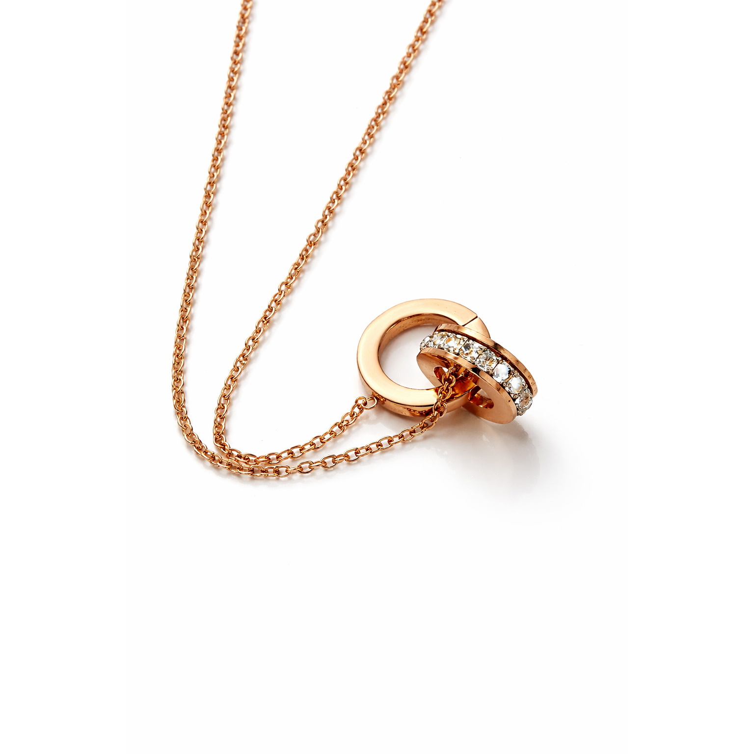 Rose Gold Interlocked Circle Pendant Necklace with Roman Numerals & CZ Stones