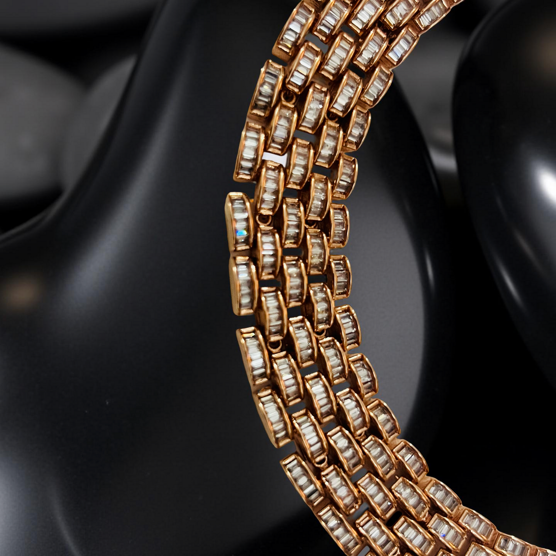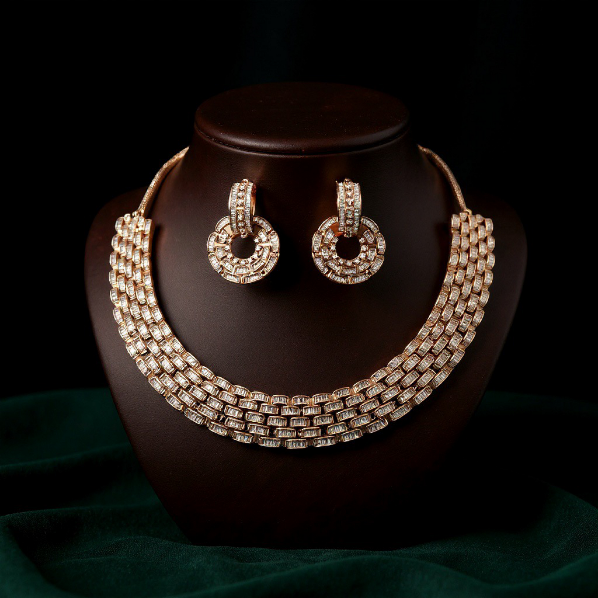 The rose gold plating lends a warm, luxurious glow that beautifully complements the brilliance of the stones. Paired with statement circular earrings featuring layered baguette detailing, this set captures the essence of refined glamour — perfect for cocktail evenings, festive occasions, and contemporary bridal looks.